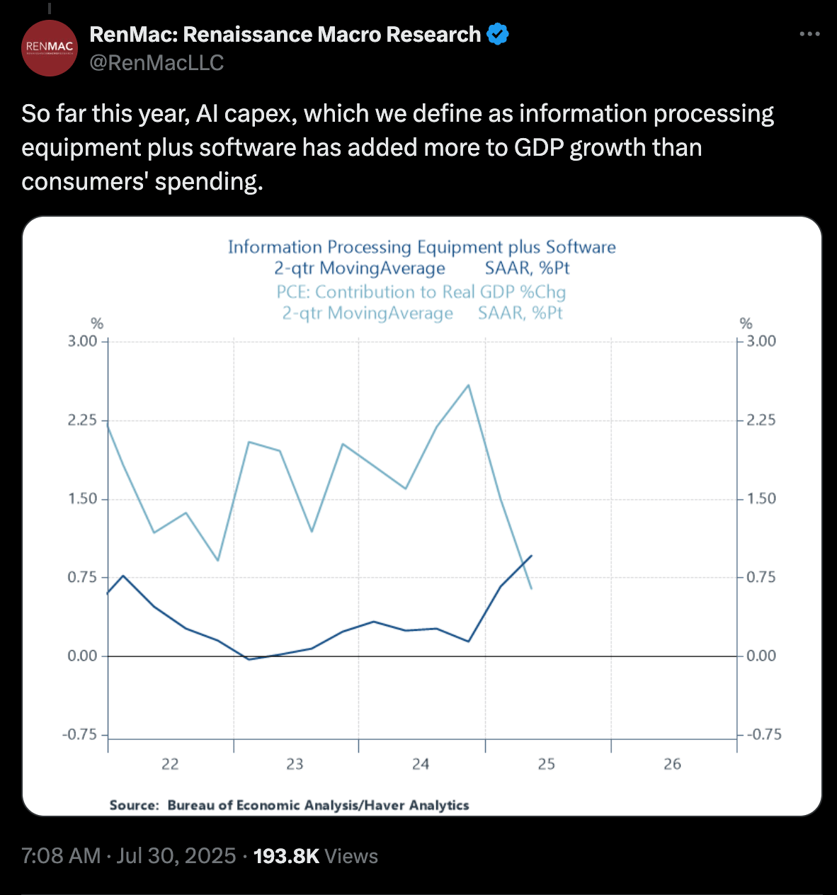 2 That $70bil of capex that Meta is spending is part of a much broader massive tidal wave of spending on data centers to support AI, currently estimated at $400bil this year. This wave of spending is so large that as of July it had a bigger impact on GDP growth than consumer spending. In other words: big tech’s spending on AI infrastructure is propping up the entire U.S. economy. This helps explain why high-level economic numbers continue to be generally positive but consumer sentiment is down.